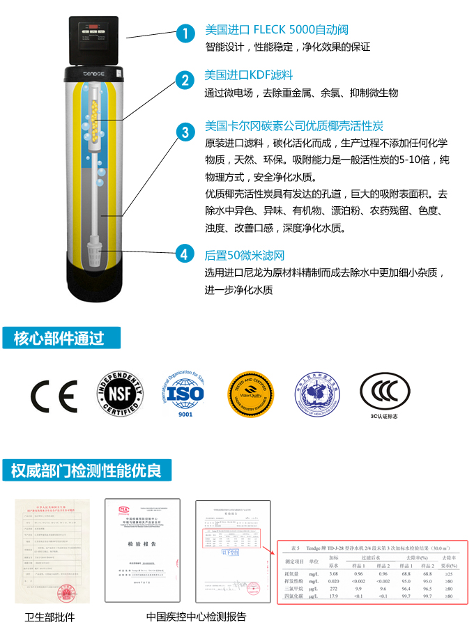 全屋凈水中央凈水機有效去除水中的異色、異味;進一步濾除水中微小雜質、膠狀體;去除水中的漂白粉余氯、農藥、重金屬;保留對人體有益的礦物質。使水變得碧清、碧藍,去除對人體有害的物質。